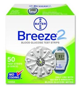 Bayer Breeze2 Test Strips feature No Coding? technology to ensure that the correct code is automatically set any time a new test strip is inserted and are packed into a 10-test disc so you don't have to handle individual strips. Bayer Breeze2 Test Strips Received Ease-of-Use commendation from the Arthritis Foundation®.