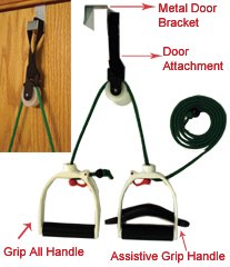 Lifeline Multi-Use Shoulder Pulley with Door Attachment and Metal Door Bracket allows you to attach a metal door bracket to the top of any door.Lifeline Multi-Use Shoulder Pulley with Door Attachment and Foam Cushion Assistive Grip (For people with limited hand strength). Comes complete with Standard Pulley System and one handle features Assistive Grip.