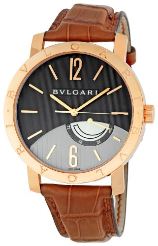 18kt rose gold case with a brown leather bracelet. 18kt rose gold bezel. Anthracite dial with rose gold-tone hands and index hour markers. Arabic numerals mark the 6, and 12 o'clock position. Luminiscent hands and dial markers. Power reserve sub-dial. Automatic movement. Scratch resistant sapphire crystal. Case diameter: 41 mm. Deployment buckle. Water resistant at 30 meters / 100 feet. Functions: hours, minutes, seconds, power reserve. Bvlgari Bvlgari Rose Gold Anthracite Automatic Mens Watch BBP41BGL.